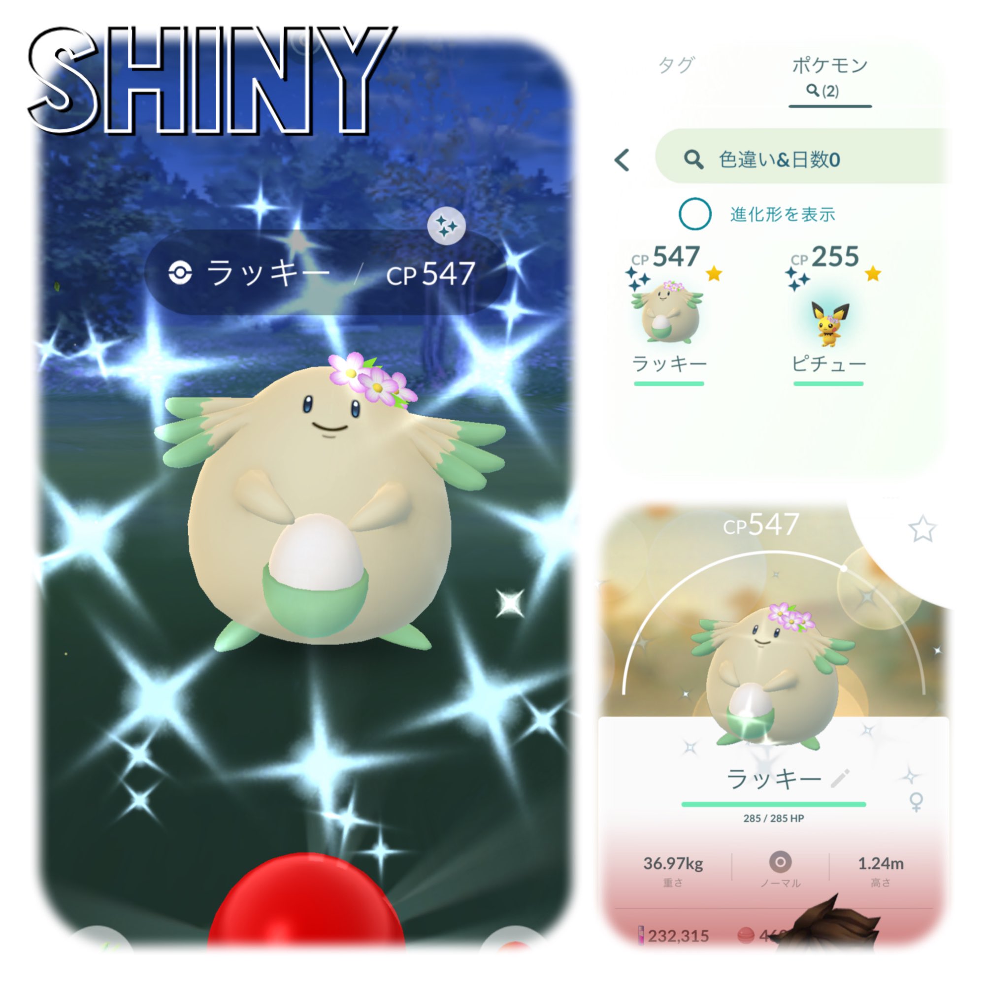 Pyonaaaan ポケモン なんと 花飾りラッキーが 光ってくれた ハピナス進化用にもう1匹欲しい のは欲張りかなぁ っ W c 2 卵割り約1個で 色違い2体目は花飾りピチュー 嬉しいけど 狙いの色違いは 花飾りイーブイなのよお